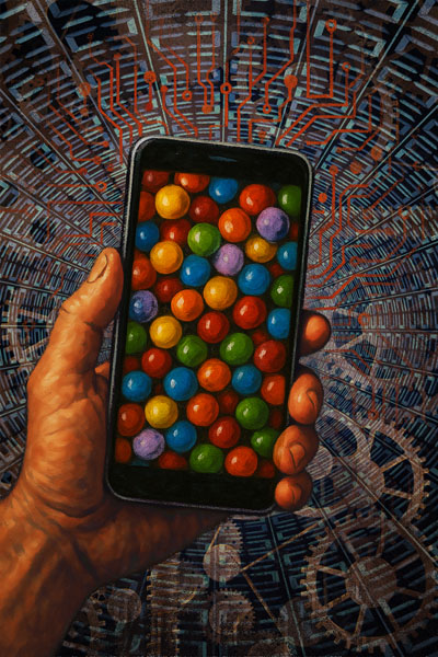 De smartphone is natuurlijk niet zomaar uit de lucht komen vallen voor het welzijn van de individuele mens. Het is is geen onschuldig hulpmiddel. Het bindt ons aan tech-bedrijven waarvan we de omvangrijke invloed nauwelijks kunnen bevroeden, laat staan de mogelijke agenda achter deze wereldwijde uitrol van smartphones en andere ‘smart-producten’. Allemaal zoete digitale ‘smarties’ die naar meer smaken en verslaven. Apps waarvan de werkelijke bedoeling zit verstopt in en tussen de zoetjes.